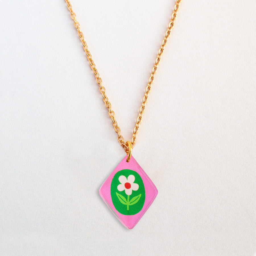 Floral Charm Square Pendant Necklace - Pink