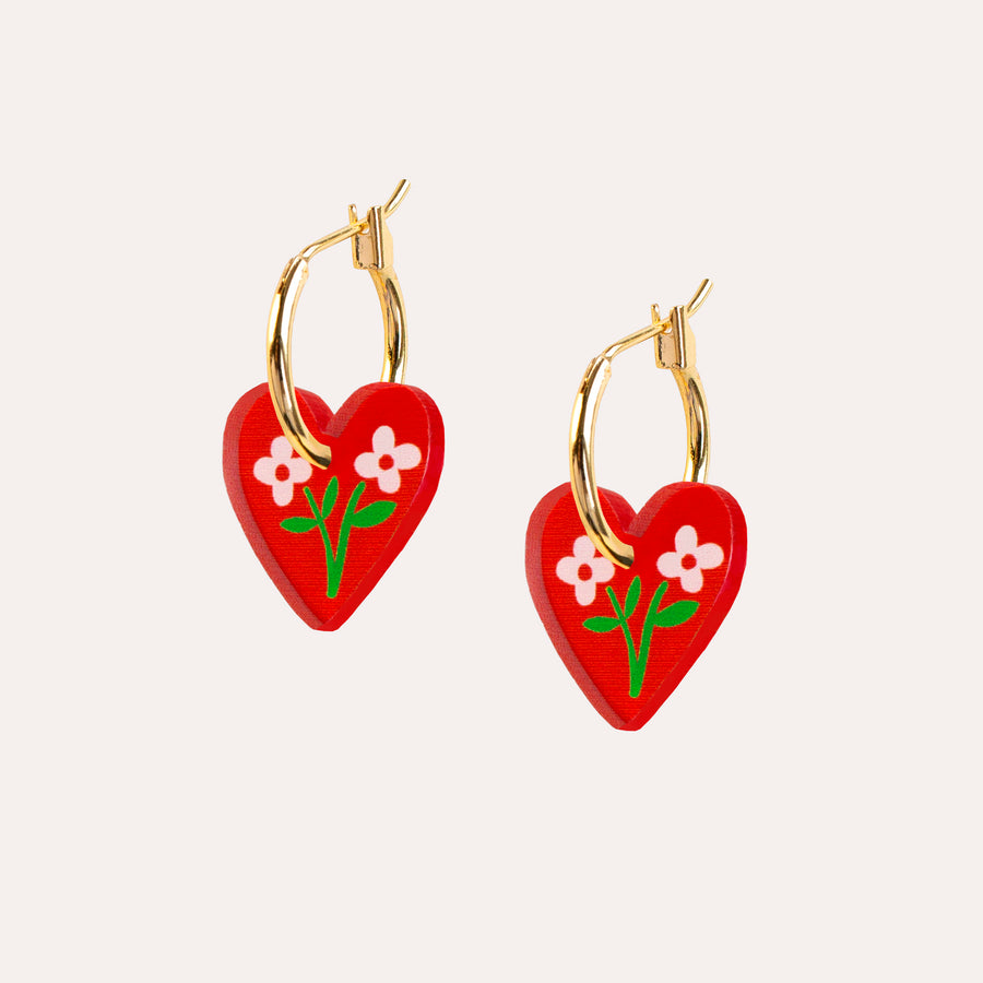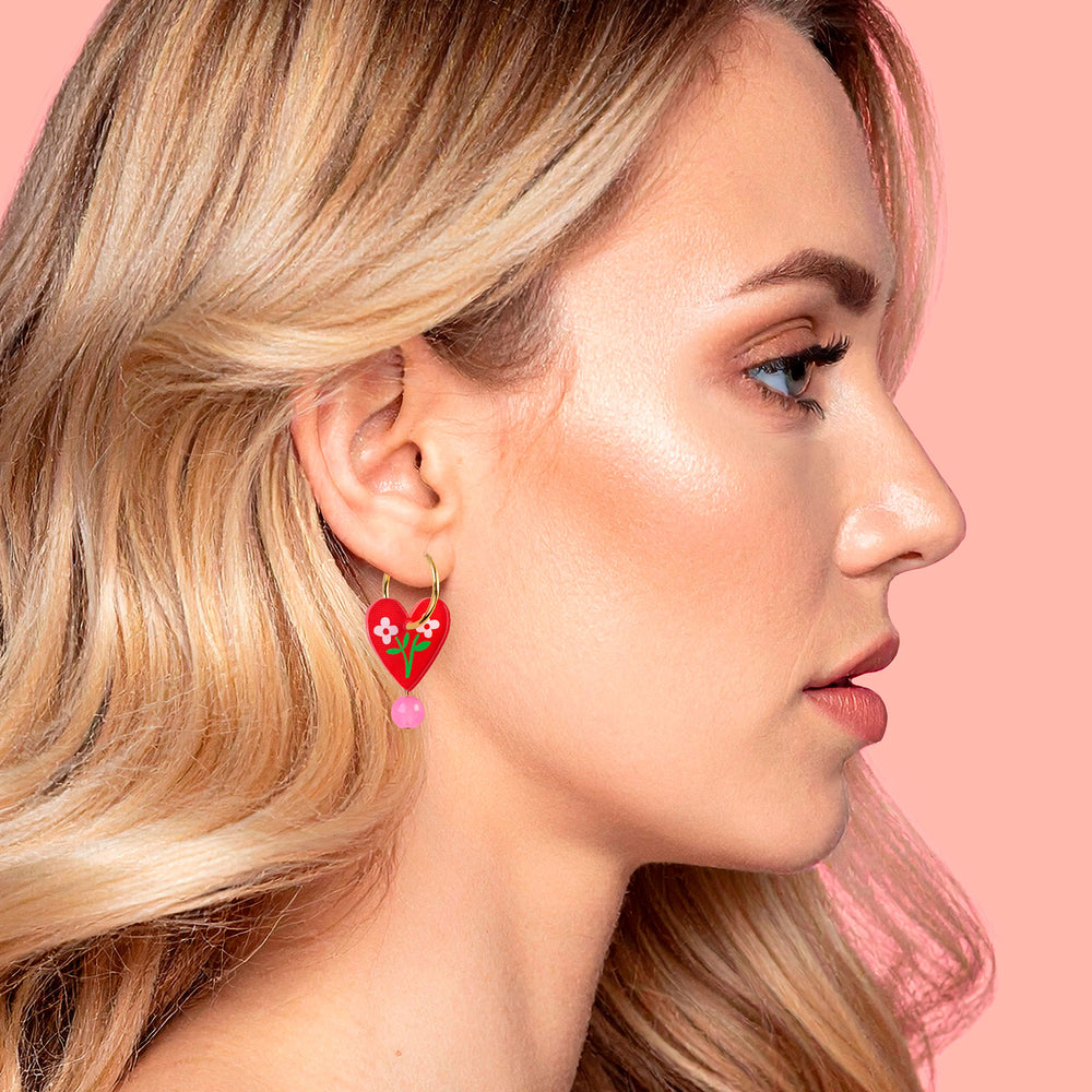 Heart Hoop Dangle Earrings - Red