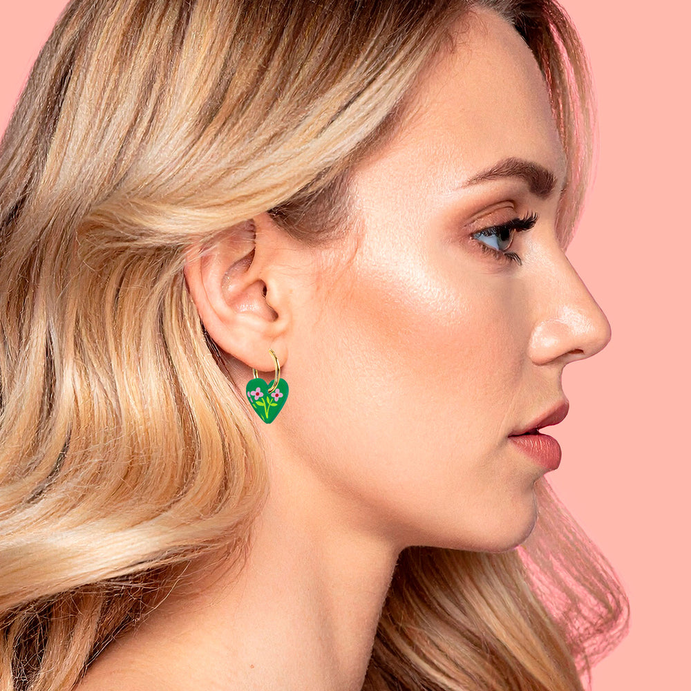 Heart Hoop Dangle Earrings - Green