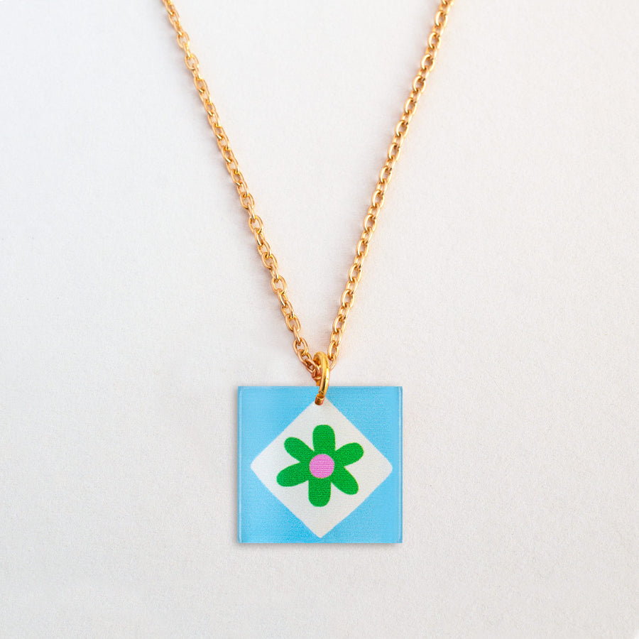 Floral Charm Square Pendant Necklace - Light Blue