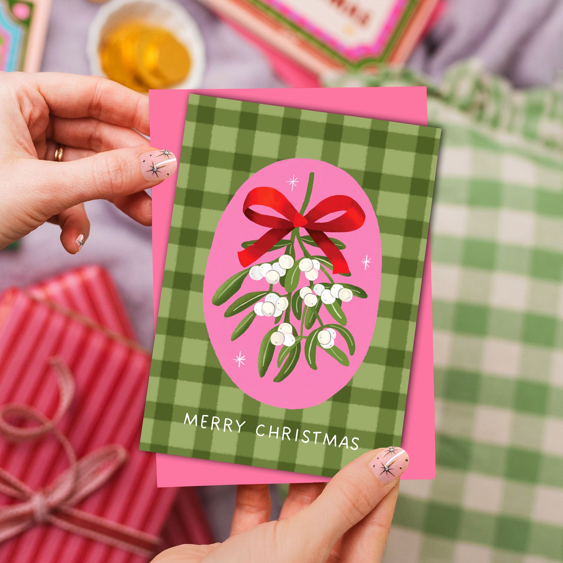This pretty Christmas card features a dark green gingham pattern, and mistletoe illustration on a bright pink background